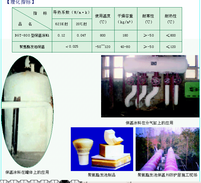 BGT-800型復(fù)合硅酸鎂保溫涂料是一種新型無機微孔網(wǎng)狀輕質(zhì)高效保溫材料,產(chǎn)品屬于不定型膏狀,施工方便、絕熱性能好、不開裂、不粉化、不脫落??蓮V泛應(yīng)用于化工、電力、冶金、石油等行業(yè)的高溫管道,尤其適用于異型熱力管網(wǎng)及閘、閥、球體的保溫隔熱。經(jīng)檢測,其各項性能指標均優(yōu)于其它傳統(tǒng)保溫材料。